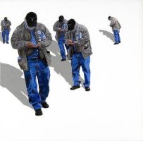 | Carol K. Brown, Pedestrian (63020), 2006 The people depicted in these paintings have become characters in an imaginary play. Against a stark white background, the intensely colored figures are replicated and arranged in groups according to Brown�s �manipulation�, thus creating relationships that never existed, but appear plausible, nonetheless. The artist explains: �As I wander streets I am often amazed at the delicious array of visuals amongst the �prosaic.� The angle of the observed and the observer is constantly shifting. By segregating, duplicating and changing scale of my subject, I am setting up hypothetical relationships, both physical and psychological. My anonymous subjects lie squarely within the realm of the public, but in their isolation, underscored by the intense shadows and ambiguous spaces, they give off very personal, private vibrations.�