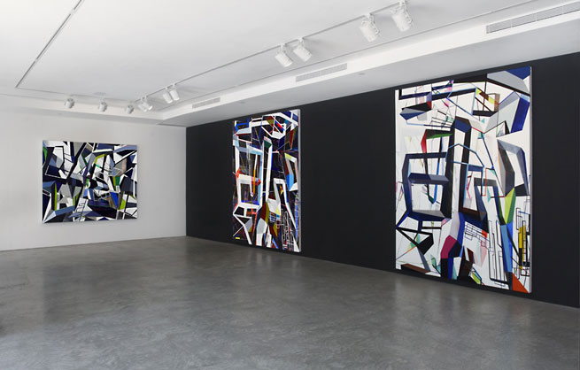 Even when Giehler�s paintings radiate cool virtuality, revealing colour-saturated artificiality and captivatingly perfect surfaces, the process of pictorial invention is never computer generated, but rather takes place directly on the canvas. Giehler begins with a freehand drawing, such as a grid or abstract form. �Not really anything concrete,� he says, �sometimes a perspective can be seen; what is important is to initially get some paint on the canvas, and then I go from there. There are no detailed sketches or preliminary drawings, and therefore no mere act of transference.�(1) Giehler develops his paintings on their supports directly on the wall. �Thus they cannot be rotated or turned upside down. Yet in Photoshop � the only program I use � I can turn them any way I want. If a horizontally hung painting then becomes a vertical work, I nevertheless continue to paint it in its horizontal orientation. Not until the canvas has been stretched on the frame can I really get a look at it.� He creates the paintings in a complex and artistically open process, into which he integrates references to other media. Often, however, it is at this point that the process really gets going: Giehler photographs the piece in its intermediate state, and may then �draw further with Photoshop. I add forms or cut something out�, he says, to then take these results and return to work on the canvas. �Processes such as these can fundamentally change the painting almost daily,� he states. Technically-assisted virtuality and a tangible painterly character � both of these alternately provide the stimulus for a linear development of the picture that can neither be planned nor predicted. This goes on until things look just right.