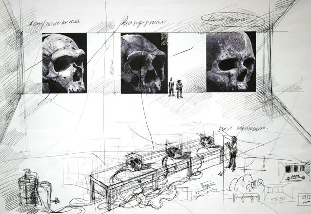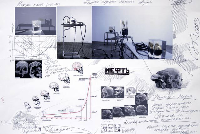 For Molodkin, oil, ink and blood are all the same. Ink is the blood of a pen. Oil is the blood of Russia. Blood will one day be oil, which may be made into ink. Boiling down corpses into oil, he reckons, is just speeding up the process. “People say I should not show,” he says apologetically, calling up his custom-made furnace thing on his computer. “They say it is like a meat-shop. But it is a simple idea. From all organic things you can make vodka or spirit. It is just a measure of time and some chemical things.”