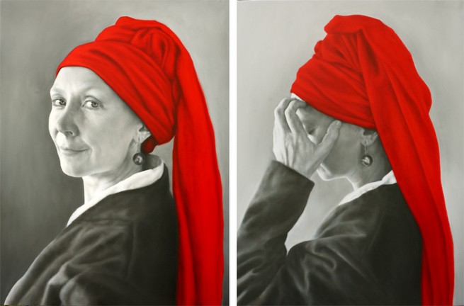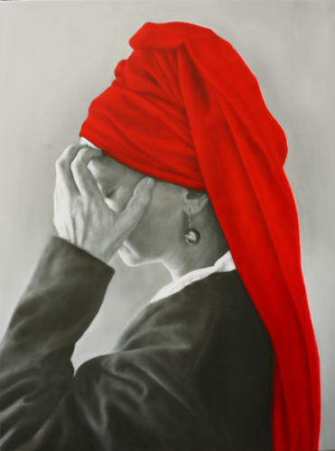 On close inspection ARINA’s handling of paint is not of bold gestures but the quiet, slow build-up of tonal values which beautifully suggest the sensual surface of the skin and underlying bone structure. The lack of hair accentuates the features of the face with the folds of the head scarf contributing to the architecture of the head, creating an almost sculptural object. The repetition and slight variation of the compositions suggest film or photographic sequences and the flat red head scarf creates a colour-field that generates an interesting shifting pictorial space for the face to occupy. ARINA uses herself as a vessel for her ideas; however, I would argue the paintings are not self-portraits. The likeness is striking and her expressions are beguiling; she occupies her face with the confidence of an actor trying to communicate to a broad audience.