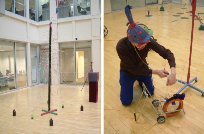 | Above two images; left – The Lost Adjuster: Liquid Route Discharger (Ascending + Descending) Mixed Media, January-February 2004. Above right – The Lost Adjuster: The Tweaker Awakes, The Adjuster Escapes…, Performance, 29th January 2004. | ||||