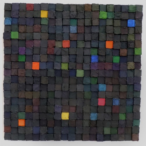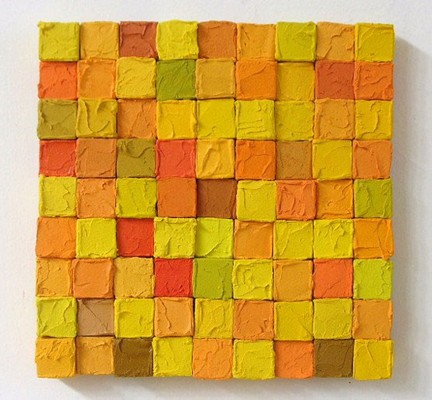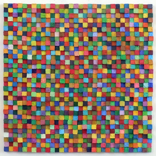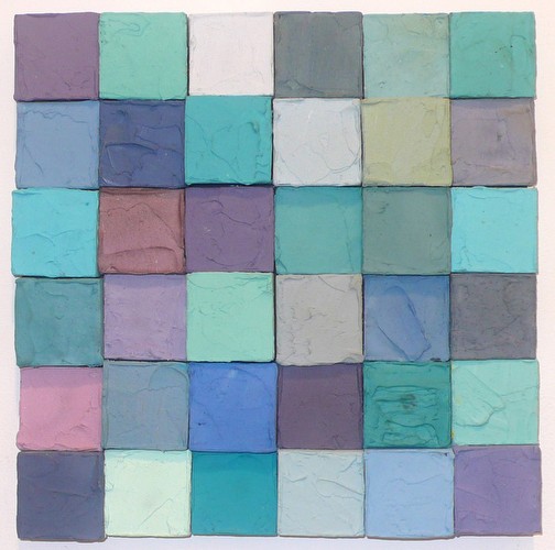 Carlos Estrada-Vega paints monochrome paintings arranged into large compositions. Each individual painting is not as important to Estrada-Vega as the labor of producing a large composition. Although finished and hung individually, each painting is only a part of a larger composition, much larger than the piece itself. Each piece is a hand made object: canvas stretched on wood; with colors mixed from pigments and mediums. Estrada-Vega's work is labor-intensive, repetitive and limited by the borders of the square. The process requires discipline. Color combinations are arranged by intuition, random selection and his own personal taste.
