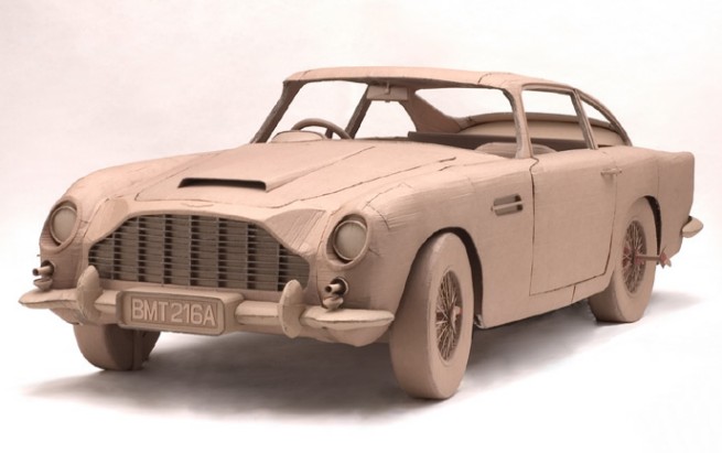 For Chris Gilmour’s first New York solo exhibition “Pussy Galore”,October 19 – November 22, 2006, Freight + Volume exhibited a life-size Aston Martin DB8, rendered in cardboard to such precision that even the most insignificant details of the engine are visible. The sculptural model pleads for reaction or interaction, coaxing the audience to hop into the driver's seat and take a spin, a la James Bond’s Pussy Galore. The automobile is presented, stripped of material constraints, as Gilmour’s latest sculptural accomplishment with steering wheel, gears, and tire spokes all in tow. Gilmour also presents, as part of his newest body of work, a series of acoustic and electric guitars as well as miniature churches modeled out of cigarette and condom boxes, again juxtaposing fiction and reality in playful jest.