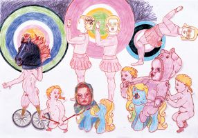 Renz’s previous works focus on young, almost prepubescent, girls in carnivalesque attire and ironically misogynist situations, “These young women are not unknowing Alice-like innocents, there is no ‘sugar and spice and all things nice’ to be appended to these Justines, Juliets or Lolitas…They challenge the stereotypes and male-dominated assumptions, the patriarchal constructions that men attempt to impose on women.”1 In Sub Rosa, Renz turns her focus to matriarchies and the private sphere. “In the private sphere, as opposed to the public sphere, power is more often exercised by women- the mothers or grandmothers. In modern families the father is becoming more and more absent leaving no one to control the female authority and allowing a shift of power from male to female and, inevitably, an abuse of power, but by the female.” In Renz’s latest series, the male subjects are shown in passive positions-sleeping in the nude, breast-feeding- but each work is imbibed with a sexualized undercurrent, bringing into question the roles of these female “nurturers”. | By reversing the gaze from female to male, Renz’s Sub Rosa is truly feminist in theory, although she also reveals the women as manipulators, exploiting and enjoying their position of power within the private family sphere. Top: Slumber 2007 Pigmentmarker and collage on paper 160 x 230 cms Left: Double 00, 2007 Pigmentmarker and collage on paper 62 x 43.2cms Below: Folie Fades, 2007 Pigmentmarker and collage on paper 62 x 43.2cms