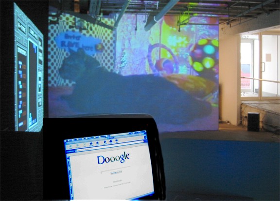 Arcangel, who graduated from Oberlin with a degree in Technology in Music and the Related Arts, came to the artworld through a number of internet based activities. These, in turn, lead to invitations from institutions for lectures and demonstrations, a performative aspect which naturally called for the creation of digital environments. These latter works evolved into stand-alone artworks, frequently exhibited with soundtracks created by Arcangel in collaboration with others, such as Paul B. Davis, a London-based disc jockey. Arcangel is interested in keeping the possibilities of collaboration open, as well as in continuing to reach out to other cultural fields for inspiration, fusing autonomous artworks with temporary and net-based actions. The show at Team, for example, marks the launch of dooogle.com, a search engine which only yields results about Doogie Howser, M.D. Also available is a new piece of software called T.A.C. (Total Asshole Compression), a program which increases the size of any file passed through it.
