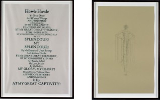 He eschews limitlessness, instead opting to focus on an end point, a barrier. At the center of this work is a floating ship or building – a fortress, linked to Charles Robert Ashbee's (1863-1942) notion of “Ship of Craft”. The second collage depicts a snowy landscape made from grass, wood and leather, again, with no horizon. The landscape in this work slowly multiplies on itself and closes itself off, creating an autonomous field of space. Three screens, wood and clear glass, have been painted with matte green and brown pigments. Their function is the reverse of glass architecture, which was designed to show the wonders of the outside world. Instead of filling the interior space with beams of light, Thorpe's screens effectively shut out all manners of natural phenomena. Reflective on one side, the opposing side is a barrier to the outside world, while the main screen is shaped like a mountain range. Thorpe has also included a poem painted on paper in early manuscript-like text. The font is a self-sufficiency style taken from 'enthusiasts' pamphlets of the English Revolutionary period that promised a world turned upside down, but ended in defeat for the Radicals. | Images from top to bottom, left to right : The Bright Light of the Fog, 2005 plaster, wax, and leather 59 x 10 cm diameter The Great Conspirator, 2005 wood, plaster, glass, cement, resin, and slate 130 x 120 x 120 cm The Quiet Ally, 2005 wood and painted glass 240 x 470 cm ( 2 panels @ 240 x 235 cm) My Beseiged Self is My Glory!, 2005 oil on paper 35 x 25 1/2 cm Defiant Jubilant, 2005 watercolor and pencil on paper 28 x 23 inches