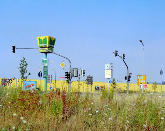 This series of photos represents 3 years work on the outskirts of more than 15 major cities within the European Union. With the concern for detail of documentary photography and taken using a large format camera, they present a personal view of these border zones. Will the green wastelands in the foreground, of no economic value, take over the suburban architecture of the background or will the opposite occur? The pictures of these zones of friction are a result of questions like this. Flattened by the lack of lines of perspective, no roads or tracks invite the viewer into the scene. The same computer-generated, cloudless sky serves to eliminate any reference to space or time and only a few signs offer any indication of linguistic or cultural variations.