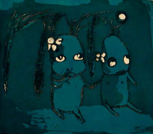 Often exotic food packaging such as that found in Japanese supermarkets or old postcards sent from aboard inspires me. I think of the characters peopling a sparse landscape made up of an amalgamation of the imagined foreign landscapes I have, maybe dark Icelandic woodland or a tropical beach somewhere / nowhere. – They are immediate, often transferred straight from the page of my sketchbook into print with as less material interference as possible. The Work is deliberately cheerful in content often drowning in colour. Its optimistic and Simple .The use of Vivid colours and crude lines equate Beauty and innocence, a theme running throughout the Babes in the wood series , a exploration of cheerfulness and feeling projection. The images occupy a place between Joy / Kitsch and unease, although the emphasis is placed on the positive side. In doing so I have tried to capture the positive side of a happy feeling and the malingering doubting which accompanies it . | After graduating from the Royal College of Art in 2002 I have worked in two specific areas Print, and Illustration. I had previously studied Illustration at degree level but found I was becoming more drawn to the narrative in my work, Print became a natural progression, some of which I animate . – I often print out a sequence of frames and its not unusual for my to practices to become intertwined and one medium to be inspired by the other, within it I am still finding new ground and possible expressive process’s which benefit each other.
