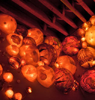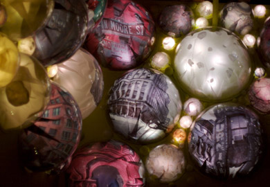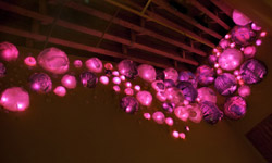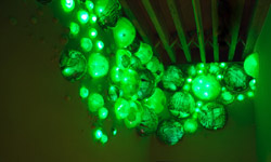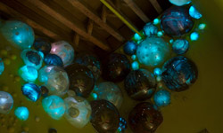 Terrarium is an installation intended to provide lighting to the lobby of a landmark building. From dusk to dawn, shifting patterns of light radiate from an assortment of acrylic bubbles mounted on the walls. The work is an organic space within the city and a simultaneous extension of the urban surroundings. The spherical shapes and colors evoke an almost amphibian quality, yet displayed within these bubbles are photographs showing us the past and present life of this building. The piece represents a middle ground between the private and public, a compromise between the tranquility of the indoors and the din of the