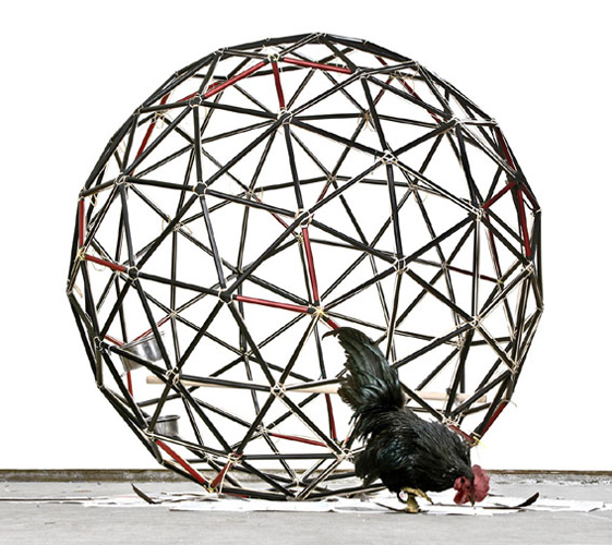 Anondized aluminium, ABS rapid-prototyped plastic, rubberbands, newsprint, rooster feathers and drop 119 cm diameter, © Iñigo Manglano-Ovalle