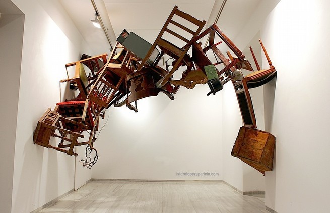 http://isidrolopezaparicio.com Arche of confuses Memories. Isidro López-Aparicio Years colecting personally objects from many places conect and built and and arche a bridgue full of human remains… Memories, about the utility of the objects… The pieces produced specifically for this art project have been made from objects collected, for over a year, from public and private institutions warehouse in the city and elsewhere in the world. The basis of this art project is the weaving of a network through the management, collection, relocation, contextualization and reinterpretation of the utility and value of the objects; from our own uncertainty raises the awareness of those reality bits which our system keeps hidden away. López-Aparicio shows this unresolved conflict and generates tools that help us look and sketch and thus move us towards a non-conformist attitude, towards alternative attitudes to the life we live. López-Aparicio, in collaboration/dialogue with the curators Sema D'Acosta and Ivan de la Torre, proposes amazing devices (pantograph, kaleidoscope, gage, pointer, compass…) that help us question the ways we perceive and skecth reality and how to draw it. Tributes to Nacho Criado, Pepe Espaliú, Manuel Rivera, Paco Muñoz… materialize movement with the fundamental traces: A call to dialogue in which the ideas are conveyed and become concrete at the ends of countless pencils and it’s traces. This project has other places of exhibition with works contextualized in Finland, Helsinki (AVA Galeria) in Estonia, Tartu (Tartu Kunstimaja), and Sudan, Khartoum (Rashid Diab Art Center). It will be hale and move to Cordoba at the fest of the “patios”, to Valencia Pazycomedias gallery, curated by Jose Luís Pérez Pont, and to Kharkov, Ukraine by María Sánchez and Mario S. Arsenal. http://isidrolopezaparicio.com Filtered Perception. Palimpsests: All established approaches generate prejudices and limit our freedom to develop. That is why society needs to generate “curtains”, in order to protect the masses from reality, it is easier to conceal reality blinding light. The problem is that those curtains make us see a biased reality, it appears strange and distant to us, a world in which we cannot find ourselves and where we feel both scared and curious. It is important to break this curtain and to trangress worlds. It is paradoxical how we feel participants of one or other place depending on which side of the curtain we are. But we cannot avoid the contradiction of wanting to stay at our side and going on watching the reality we see although it is filtered, from our anonymity safety we want to trangress the limit and become a part of the other reality as a knowledge and understanding process. Images are superimposed like our memories and they are turned upside down in a way they create a new world. Reality, memories and oneiric live together in these works as a part of our perception of the world. The images are built with a structure of palimpsests in which some images are shown on the others, fanciful relations with present are made by persistence of memory, creating certain uncertainty in front of what is noticed and known.
