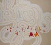 | Detiger’s hallucinatory backgrounds and flush color palette create an amorphous visual setting for the subtle interactions of his figures, firmly setting his happy tone. This jocular environment simultaneously references the frenetic and chaotic nature of our media obsessed culture, which bombards us with empty imagery. In Detiger’s hands this portentous obsession is transformed to contentment just shy of complicity. We are aware of our vain foibles and yet not asked to give them the full weight of guilt but to put them in their rightful, playful place. Detiger’s paintings rather than scathing indictments are lyrical musings on the pop shallowness of advertising culture, allowing us to bask in the colorful vapidity of an idealized world of comfort yet dispensing with the naivete. | |||||||||