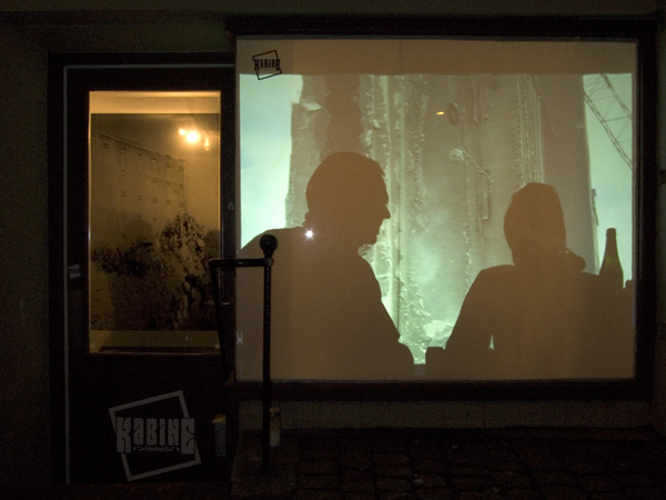 Videowork 'All that is solid melts into air' seen from the street and film print mounted on the door..