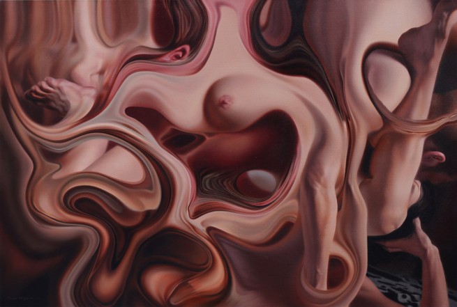 Series entitled “Together, yet apart” is consisted of paintings depicting a young couple’s intimacy. Distortions and scattered parts of their bodies are not only a result of an artistic expression – they create new, recognizable shapes (an egg, a silhouette of embryo, etc.) whose symbolism expands the pre existing narrative concept. In addition to the bodies’ gesture meanings, they suggest a turbulent human relationship that is the origin of numerous problems as well as challenges. The girl and the young man from each painting are friends of mine. Lives full of confrontations, disappointments and misfortune are not only their own – a huge number of young people all over the world live in a similar way, asking numerous questions both themselves and entire society.