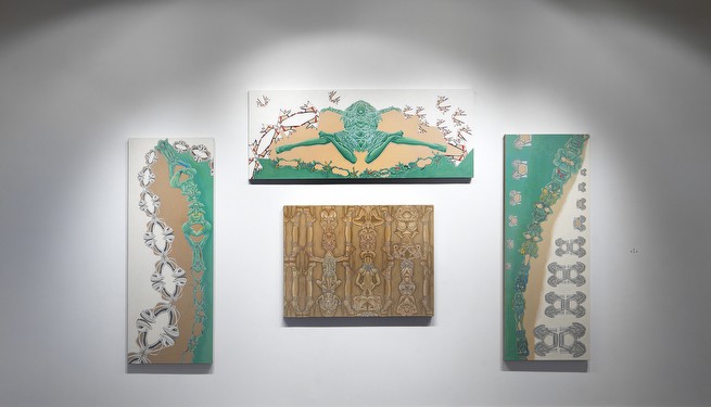 I work in series, which variously reflect my interest in social dynamics. Most of the imagery submitted addresses the impact of commercial media representations of women. My appropriation and replication of their contours reflects the shaping of personal narratives/identities forged from ubiquitous, media manufactured archetypes. The cult of the individual has become one of emulation, leading, in various degrees, to a post-feminist re-embrace of our own objectification. The “Appearances” paintings simulate the worldly beauty/ power of historic Eastern deity icons such as Buddhist images of Bodhisattvas-charged with guiding souls to spiritual perfection- and in these works links it to the visual supremacy of media ‘goddesses’. My tracings and manipulated fusions of these perfected bodies and my resultant distortions are intended to resonate with the troubling consequences of identities built on commercial desire. “Temple Construction” is a category of works that includes groups of paintings, “Turning to Stone” and “Freeze”. The imagery and titles reference the hierarchy of power and devotion that the beauty industry inspires. The dimensions of the works, Turning to Stone, resonate with those required for a career in modeling- and depicts fashion figures totemically, as deity icons in a temple frieze, ‘biblically’ turning to stone in contemplation of ‘high end’, ‘must have.’ accessories. In the “Traffic” series, I use the neutrality of sign figuration to fashion a codex, to map less visible dynamics of the social landscape- here the intersection of beauty and desire, the media, and human trafficking.