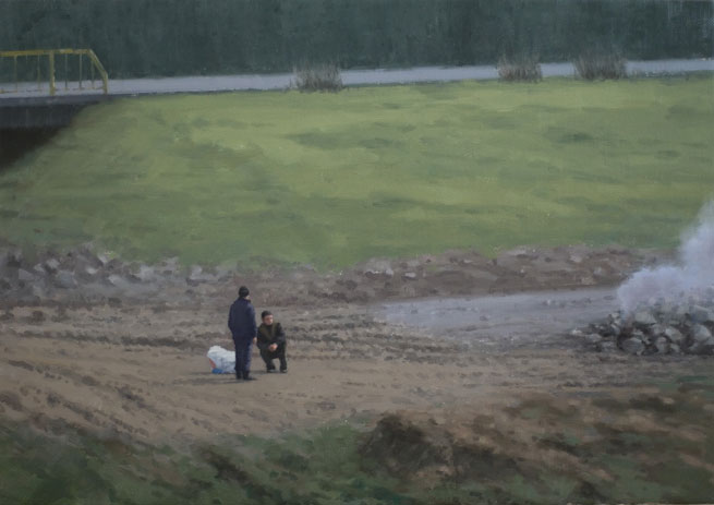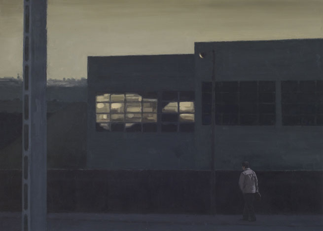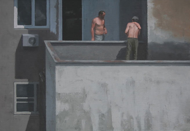 Serban Savu is a figurative painter. His skilfully rendered canvases capture the daily existence of contemporary Romanians at work and leisure. Savu treats his protagonists’ facial characteristics in a generic manner, causing their individual identities to remain elusive. Interior scenes depict people unaware of our gaze and absorbed in their own worlds, viewed through glass and embedded in compositions governed by architectural features. Exterior rural landscapes often portray solitary figures in the middle-distance, isolated and overwhelmed.