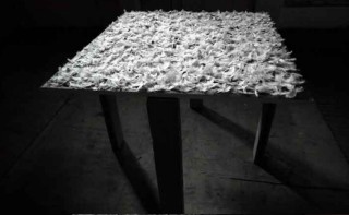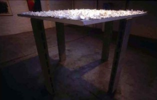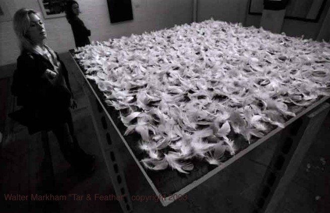 | The photographs on this page are of an artwork titled: "Tar and Feather Painting,First Variation". The piece was exhibited at the Irving Goldman Gallery, Jersey City, NJ in 2002. Dimensions variable. This version: 84x84x52". Materials: Stretched canvas,roofing cement(tar),goose feathers and cinder blocks. |