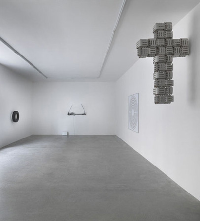 | Thomas Bayrle Alle Kamele sind ein Kamel (Schopenhauer) June 12 - July 31, 2010 Ein PKW-Reifen aus Holz, in dessen Profil die ersten Worte des bekannten Rosenkranzgebetes eingefr�st sind, der sich wie eine Gebetsm�hle zu drehen beginnt, wenn man ihn leicht ber�hrt... ein manipulierter Porschemotor, kombiniert mit einer Soundmontage (Kooperation mit Bernhard Schreiner), die den satten Sound eines Porsche-motors mit dem Sing-Sang einer Gruppe betender Frauen mischt... ein isoliertes Paar Scheibenwischer, das sich vor wei�er Wand menetekelartig bewegt und rhythmisch zu den schwingenden Wischern einen peitschenden Singsang: �Bitt f�r uns� skandiert... ein Siebdruck, der die labyrinthische Struktur des bekannten Fu�bodenmosaiks aus der Kathedrale von Chartres wiedergibt und in eine Wasser-Abf�llmaschinerie verwandelt... In der Ausstellung f�hrt Thomas Bayrle, der sich seit den 1970er Jahren mit Massenph�nomenen jeglicher Art besch�ftigt, die zentralen k�nstlerischen wie geistigen Str�nge seines Werks im �bergeordneten Sinn zusammen. Formale Aspekte wie Monotonie und Repetitivit�t, durchg�ngiges Konstruktionsprinzip beispielsweise seiner bekannten Collagen und Siebdrucke, treffen in einer Art maschinenhafter Parallelschaltung als Sound-Mischung auf die Themenkomplexe Religion, Massenmobilit�t und �konomie, die Bayrle in seinen Arbeiten bereits seit vielen Jahren kommentiert und interpretiert. Dank an: Peter Bayrle / Anton Schwinghammer / Andreas Funkenhauser / St. Josefs Gemeinde Frankfurt - Eschersheim "Die �westliche� Entsprechung der ��stlichen� Meditation war �ber lange Zeiten das Gebet. Seine Formen reichen von tiefster Inbrunst bis zu literarischer Winkeladvokatie � im Hader mit Gott. � Im Halbdunkel der Kirche sitzen alte Frauen und beten den Rosenkranz. Dicht gedr�ngt � auf B�nken � murmeln sie wie ein unheimlicher Bach. Sind sie summender, kollektiver Leib, der � endlos langsam � Kugel f�r Kugel durch seine H�nde bewegt. Sie arbeiten am gro�en �Geweb� und murmeln und weben stundenlang. (das hatte ich fast vergessen) Im rasenden L�rm einer Fabrikhalle � der Weberei Gutmann in G�ppingen � kam das Gemurmel der Frauen im Sing-Sang der Maschinen auf mich zur�ck. Die Kurbelwellen der Webautomaten sangen bei einer bestimmten Frequenz �menschlich�. Wie 2 Kupplungsscheiben gingen die Ges�nge aufeinander zu und schlossen sich kurz. So kamen die Stimmen von Innen heraus � das Gemurmel als B�sse verschmolz mit dem jammernden Metall zu einer Einheit. So singsang ich die Stunden und Tage durch � und konnte 1 Jahr �berwintern. � Auch in den Discos � oder beim Autofahr�n � schlich dieser geheime Sing-Sang mit � als w�ren die Frauen tief im Getriebe eingeschlossen und dr�ngten durch die Vibration nach au�en. Oder als Unwucht der Reifen � die begreifen � dass � VA TER UN SER DER DU BIST IM HIM MEL als Profil in ihnen steckt � und w�hrend sie rasen � sie beten � auf 300 km � 1.244.000 mal." Thomas Bayrle, A U T O M E D I T A T I O N, 19.2.1987 (aus: Thomas Bayrle 1967 und 1987, Ausstellungskatalog Frankfurter Kunstverein 1987) A wooden car tire, with the first words of the familiar rosary as its tread, that begins to rotate like a prayer wheel when touched lightly... a manipulated Porsche motor, combined with a sound montage (cooperation with Bernhard Schreiner) that mixes the lush sound of the engine with the sing-song of a group of women at prayer ... an isolated pair of windscreen wipers that move like a portent in front of a white wall, while chanting a scourging �Pray for us� in time to the rhythmic back-and-forth... a silkscreen that reproduces the labyrinthine structure of the famous floor mosaic of Chartres Cathedral and transforms it into a water-bottling machine ... In this exhibition Thomas Bayrle, who has been occupied with mass phenomena of all kinds since the 1970s, brings together in a higher sense the central artistic and intellectual strands of his work. Formal aspects such as monotony and repetition, consistent constructive principles � for example in his well-known collages and silkscreens, come together in a kind of machine-like parallel circuit encompassing the themes of religion, mass mobility and economics, which Bayrle has commented and interpreted in his work for many years now. Many Thanks to: Peter Bayrle / Anton Schwinghammer / Andreas Funkenhauser / St. Josefs Gemeinde Frankfurt - Eschersheim �For a long time the �Western� equivalent to �Eastern� meditation was prayer. Its forms range from deep ardour to literary hedging and quarrelling with God. � In the semi-darkness of the church old women say their rosaries. Crowded together on the pews, they murmur like an eerie stream. They are a humming collective body that � endlessly, slowly � moves bead after bead through its hands. They are working a great web and they murmur and weave for hours. (I almost forgot) In the frenzied din of the factory floor � of the Gutmann weaving mill in G�ppingen � the murmuring of the women came back to me in the sing-song of the machines. At a certain frequency, the crankshafts of the automatic looms sang �humanly�. Like 2 clutch plates, the songs approached and joined with one another. So the voices came from within ... the murmuring as bass line melted into a unity with the wailing metal. So I sing-song through the hours and days � and could hibernate for 1 year. � In the discos too � or drivin� the car � this secret sing-song crept in ... as if the women were embedded deep within the gearbox and emanating outwards through the vibration. Or as an imbalance of the tires � who understand � that � OUR FA THER WHO ART IN HEA VEN is in their tread � and while they speed � they pray ... in 300 km ... 1,244,000 times.� Thomas Bayrle, A U T O M E D I T A T I O N, 19.2.1987 (Quoted from: Thomas Bayrle 1967 und 1987, e