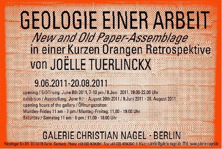 | Joëlle Tuerlinckx "Geologie einer Arbeit. New and Old Paper-Assemblage in einer Kurzen Orangen Retrospektive" 09.06.2011 - 20.08.2011 Galerie Christian Nagel Weydinger Str. 2/4 10178 Berlin Tel. 030-40042641 Fax 030-40042642 Öffnungszeiten: Montag - Freitag: 11.00 - 19.00 Uhr Samstag 11.00 - 18.00 Uhr [email protected] | ||||