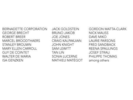 | The Evryali Score Curated by Olivia Shao 525 & 533 West 19th Street June 29 - July 30, 2010 Opening reception: Tuesday, June 29, 6 - 8pm Walkthrough with the curator: 6 - 6:30pm Featuring works by: Bernadette Corporation, George Brecht, Robert Breer, Marcel Broodthaers, Stanley Brouwn, Mary Ellen Carroll, Guy de Cointet, Willem de Rooij, Isa Genzken, Jack Goldstein, Bruno Jakob, Joe Jones, Craig Kalpakjian, John Knight, Sam Lewitt, Tan Lin, Sonia Lucerne, Mathieu Mat�got, Gordon Matta-Clark, Nick Mauss, Dave Miko, Max Neuhaus, Laurie Parsons, Fred Sandback, Reena Spaulings, Josef Strau, Philippe Thomas, among others. June 5, 2010 Klaus Biesenbach Curator at Large Museum of Modern Art 11 West 53rd Street New York, NY 10019 Dear Klaus, I hope this letter finds you well � and congratulations on the success of the �Greater New York� show. After seeing �The Baghdad batteries,� the first of PS1's Rotating Gallery exhibitions, I invited its curator Olivia Shao to organize the summer show at my gallery. I would therefore like to request to borrow �The Baghdad batteries� exhibition after it closes at PS1, as Olivia has the idea to reinstall that show in one of the galleries here. Then, in the adjacent gallery, she will curate a new exhibition that will use the existing show as a point of departure. The entire two-gallery exhibition will be given a new title, and we are planning to open on June 29th. We very much look forward to being in contact with your team at PS1 regarding practical matters of transportation, etc. In the meantime, thank you very much for your consideration of our request. Best regards, David Zwirner | ||||