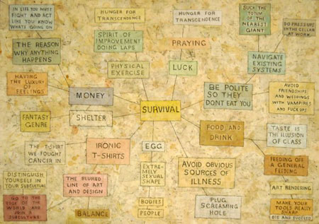| Galeria Fortes Vila�a Simon Evans - Failing At living Alone 08.06.2010 | 17.07.2010 Galeria Fortes Vila�a is pleased to present British artist Simon Evans's first solo show in Brazil. The exhibition features fifteen works on paper. His oeuvre is characterized by the obsessive gesture of overlaying small fragments of text, words, colors and cut-out images. Evans works with lists, classifications, organizational charts, and fictitious taxonomies in a ceaseless exercise of mapping the psyche as well as everyday feelings or even limit-situations. In order to deal with the range of human complexity, the artist overlays humor, cynicism, frankness and pain in a strategy which in his view approximates a psychoanalytic process. Among the works that involve classifications, Daddy Issues presents dozens of male heads cut out from books and magazines, arranged side-by-side like a large informative diagram. Each figure is associated with a phrase consisting of a pithy saying, a sarcastic adjective, or an apparently senseless expression, all of which seem to bear personal references. This investigation of more-or-less known types winds up creating a series of new archetypes that aspire toward universality. In People I Know and Life Garage Sale, people and objects are categorized within this same logic. Survival is a mapping, in the form of an organizational chart, of the dilemmas that everyone faces to survive. Categories such as shelter, money, "hunger for transcendence" and "navigate existing systems" appear bounded by fields of different colors and connected by lines, in a hierarchy created by the artist himself. All of the categories lead to the central field of the drawing that contains the word "survival." For its part, Relationship Picture involves different aspects of a relationship organized in a multicolored pie chart. In an ironic gesture of inversion, the artist refers to the recent episode of rescuing citizens after the big earthquake in Haiti. In the artwork USS Comfort, named after the rescue ship that traveled to the island, Evans presents a schematic drawing of the cruise ship Queen Mary 2, identifying the ship's various entertainment and service areas, freely associating them to aspects of contemporary society. In this way, the artist mixes the public with the private, the personal with the universal, in a continuous striving to establish order in chaos. The artist's work has been featured in two group shows in Brazil: the 27th Bienal de S�o Paulo in 2007, curated by Lisette Lagnado and the 31st Panorama de Arte Brasileira in 2009, curated by Adriano Pedrosa. Venues that have recently shown his works include the Tate Modern, London, United Kingdom; MoMA, San Francisco, USA; Louisiana Museum of Modern Art, Denmark; Mori Art Museum, Tokyo, Japan; Pasadena Museum of California Art, USA; and Frankfurter Kunstverein, Germany. | ||||