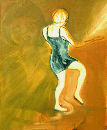 | Lucy Stein Inadequate Tableaux Lucy Stein�s new paintings are life affirming whilst acknowledging that bleakly comedic twists of fate can dramatically influence our lives. Stein makes figurative oil paintings and drawings, often incorporating elements of collage such as magazine cut-outs, drawings and materials such make up or cigarette butts. By using different techniques to create works, Stein allows her art to have different rhythms and tempos. Some of the works are heavily encrusted, made over a sustained period as she grappled with her subject matter. Others, such as her ink drawings, are more spontaneous and display a more energetic slight of hand. All however, combine text and image to express concern for cleansing, purifying and feminine anxiety. Expanding upon the themes that characterised previous works such as female sexuality and the reliance of prescription drugs to solve our problems, Stein now offers alternative ways through her anxious and chaotic landscapes. We catch glimpses of figures as they walk out of the picture space in swimming gear. While for most of us appearing in our swimming costumes can be an embarrassing ritual, Stein sees the act as empowering. Swimming is presented as an alternative drug: a coping mechanism that provides both space and time for personal contemplation. But besides that, Stein points to the funny side of swimming. Frenzied psychedelic paintings incorporate the speedo logo reminding us of that mixture of awkwardness and absurdity when we see people in their swimming trunks. For her second solo exhibition at Gimpel Fils, Stein has also created a series of works that position process and chance at their centre. Stein has developed a system of drawing that she describes as the 'some girls are bigger than others' method. Black ink is poured liberally down the paper and figures are drawn struggling to fit into, or escape from, the spidery gaps. The size and shape of her female figures are dependent on chance and undermine the contemporary desire to control body size and weight. Stein�s message seems to be that environment and luck are more influential on our self-image than we would like to admit. Equally these works demonstrate Stein�s willingness and ability to step back from her work and allow the processes of how she works influence the content. To coincide with Lucy Stein�s exhibition we are delighted to present work by Shana Moulton in the Downstairs gallery. Stein and Moulton studied at De Ateliers in Amsterdam together and have collaborated on the video piece, Cynthiaesthesia, included in Moulton�s exhibition. Lucy Stein graduated from Glasgow School of Art in 2004 and has recently completed her postgraduate studies at De Ateliers, Amsterdam. She has exhibited widely, both as a solo artist and as part of the duo Blood �n Feathers. In 2005 she was included in the group exhibition Campbell�s Soup, curated by Neil Mulholland. The following year she was selected for the show Glasgow at Lightbox, LA, curated by Nick McCarthy of Franz Ferdinand and Just in Time, at Stedelijk Museum, Amsterdam, curated by Maxine Kopsa. Lucy Stein has had several solo shows, including Holy Worry, Gimpel Fils, 2005 and Lucy Stein - Paintings and drawings, at Stedelijk Museum Bureau Amsterdam in 2006. With Jo Robertson, Blood �n Feathers was nominated for the Beck�s Futures Prize 2006. DOWNSTAIRS Shana Moulton Whispering Pines Shana Moulton creates performance and video works that examine bodily and spiritual anxieties and their relationship to popular culture, self-help goods and functionless consumer objects. For her exhibition at Gimpel Fils, Moulton will present works from her on-going video series Whispering Pines. In these works, Moulton creates surreal narratives about the life of Cynthia, a woman trapped in a mundane life searching for enlightenment. In her series of episodic videos Cynthia engages in pathetic situations that become playful and profound. Using visual and aural displacements to create narrative twists, Moulton reveals the strangeness of reality and an endless labyrinth of associations that can be drawn from the trashiest of media and consumer goods. Moulton�s work probes the limitations and fantasies of twenty-first century femininity. Combining an unsettling, wry humour with a low-tech, pop sensibility, Moulton enacts Cynthia, a character whose interactions with the everyday world are humdrum but which become dreamlike and strange thanks to her engagement with new age symbols and alchemical rituals. Through her banal home decorations, Cynthia searches for fulfilment, purpose and salvation. Her struggles with the mundane, the eclectic and the disposable, offer a unique perspective on the relationship between spirituality and consumerism in contemporary society. During the private view on Thursday 6 September Shana Moulton will bring Cynthia and her strange world to life through an innovative use of sets, props, costume and video. Coinciding with Shana Moulton�s exhibition we will be presenting new work by Lucy Stein in the Main Gallery. Moulton and Stein studied at De Ateliers in Amsterdam together and have collaborated on the video piece, Cynthiaesthesia, included in Moulton�s exhibition. Shana Moulton studied at the University of California, Berkeley and attended the MFA program at Carnegie Mellon University, Pittsburgh. Moulton has also recently attended the Skowhegan School of Painting and Sculpture in Skowhegan, Maine, and studied at De Ateliers in Amsterdam. Her video work has been screened and exhibited internationally, including at Loop '05 Video Festival, Barcelona; Rencontres internationales Paris/Berlin, Paris; Dark Light Festival, Dublin; Impakt Festival, Utrecht; Internationale Kurzfilmtage, Oberhausen; European Media Arts Festival, Osnabruck; Fondazione Mudima, Milan; Galerie Fons Welters, Amsterdam; New Media Festival, Seoul; Version Festival, Chicago; Portland Documentary and Experimental Film Festi