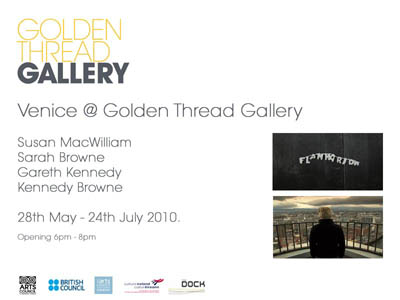 | Venice @ Golden Thread Gallery 28th May - 24 July Venice @ Golden Thread Gallery launches on Friday 28th May 2010 at 6pm. The exhibition features a joint presentation of the exhibitions which represented Northern Ireland and Ireland at the world�s most prestigious visual arts showcase, the Venice Biennale, at Northern Ireland�s leading international contemporary art gallery. The exhibitions from Northern Ireland and Ireland at the 2009 Venice Biennale showcased the work of Susan MacWilliam (Northern Ireland) and Sarah Browne, Gareth Kennedy and a Kennedy Browne collaboration (Ireland). The Golden Thread Gallery is pleased to bring this work to audiences in the North of Ireland for the first time. Susan MacWilliam�s presentation for Northern Ireland at the Venice Biennale was organised and funded by the Arts Council of Northern Ireland and the British Council and was curated by Karen Downey. MacWilliam is one of the leading artists to emerge from the North of Ireland in the last decade. The Golden Thread Gallery will present her Venice commissioned video work F-L-A-M-M-A-R-I-O-N. Centering on the events of a 1931 s�ance the work reflects her fascination with the world of the paranormal and raises questions about the possibilities and limitations of language, vision and representation. Ireland�s presentation in Venice was an initiative of Culture Ireland and the Arts Council/An Chomhairle Eala�on. The exhibition curated and commissioned by Caoimh�n Corrigan, featured solo and collaborative works by Sarah Browne and Gareth Kennedy. Aspects of contemporary Ireland feature strongly in their works, which address issues of identity, labour, globalisation, economics, language, materiality and the construction of social space. Venice @ Golden Thread Gallery continues until the 24th July 2010. Project Space Small Wonder 3rd - 17th June Small Wonder is a collaboration between JEMA (The John Erickson Museum of Art) and the Golden Thread Gallery and explores the space between the realm of the imaginary and the miniature. The exhibition combines work produced for JEMA�s Next Chapter, paper works based on the miniature Museum�s plans that will eventually combine to form a book, and two new works by Fiona Larkin, developed directly from her JEMA Next Chapter project. Curated by Brendan Jamison, Sarah McAvera and Eleanor Phillips, the exhibition presents an alternative viewing of JEMA�s paper works alongside Fiona Larkin�s sound work The Listeners (Museum Whisperers) and performance The Woman Flag. A New work by Fluxus artist Ben Patterson Bollywood Love: Object of Desire will also be on display in the JEMA gallery. Next Chapter The JEMA Next Chapter spaces re-envision a page as a site for a museum project space. Artists were invited to produce work for the space provided, free of a specific theme. The notion that 'hypothetical thinking is still a form of reality' was a guiding force in the operation and conception of this project. The project includes 28 artists, of which 16 are Belfast-based and another set of the works produced will be on show at the Raccolte Frugone museum in Genoa, Italy. JEMA Director Sean Miller will be in Belfast on Tuesday 8th and Wednesday 9th June to present performances and collage projects with JEMA's giant rubber stamp and the JEMA walking stick galleries that will be toured throughout the streets of Belfast. The walking tour will depart from the gallery at 12pm on Tuesday 8th June. Fiona Larkin: The Listeners (Museum Whisperers) / The Woman Flag For The Listeners (Museum Whisperers) Larkin has recorded the internal musings of the gallery audience. They don�t tell you what to think but offer you an insight into the musings of others as they peruse the museums cultural offerings. These audio guides turn the voice of knowledge and authority on its head. This voice is internal, honest, not always comprehensive. The gaps leave a space for us to explore our own thoughts and musings in response to what we see. The Woman Flag subverts our pre-conceived notions of a flag as a banner for advertising, identity, a way or raising awareness of the museum. As an emblem it bears little relationship to museum audience and stands towering above. For the purpose of the exhibition it will be brought down to earth and made human, animated beyond its usual function. This performance will take place on Friday 4th June between 10.30am and 14.30pm. Northern Ireland Press Photographers Association Awards Exhibition 1st � 20th July 2010. The Golden Thread Gallery presents the Northern Ireland Press Photographers Association Annual Awards Exhibition. Every year NIPPA launches its search for the best photo journalists in the province. Through the BT Northern Ireland Press Photographer of the Year competition the outstanding work of Northern Ireland�s press photographers is duly recognised and rewarded. Not to be missed. | ||||