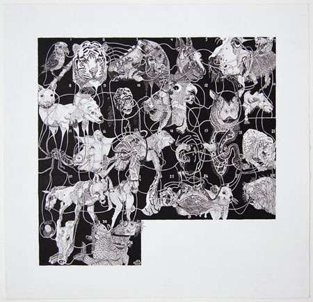| Martin Wilner Making History: UK Private view: Thursday 15 April 6-8pm 16 April - 29 May Hales Gallery is pleased to announce the first solo exhibition by New York based artist Martin Wilner. Making history: UK features twelve pen, ink, and graphite drawings, each representing a month in 2009 and are a continuation of Wilner's ongoing work Making History. Also on view will be recent examples of Wilner's other ongoing project, Journal of Evidence Weekly. Wilner's series Making History uses the convention of the Roman calendar to capture the dimension of time. He deconstructed various elements of newspapers and magazines, selecting images, texts, and maps to create monthly drawings that are the result of a game of cadavre exquis played solitaire. Each total drawing is comprised of all the days of the particular month it was worked on. For Making History: 2009, Wilner decided to utilise British newspapers for the entire year as source material for his appropriationist draftsmanship, primarily The Guardian, but also The Times, The Daily Telegraph, The Independent and even The Sun. Wilner found himself as an artist, increasingly involved in a reverse migratory process akin to the 19th Century social scientist Alexis de Tocqueville in his renowned study Democracy in America. While Wilner remained physically in the United States, he was able to have the virtual experience of life in the United Kingdom through the prism of its online media. He became increasingly fascinated with British journalists' lack of concern to conceal their political bias and to find that in a nation of libel tourism, journalists themselves drift regularly into the scandalous, in often-hilarious fashion. 2009 saw the worst international economic recession since the Great Depression of 1929, and a year of worsening climatic devastation. Making History: May 2009 tells the tale of the collapse of the American auto industry, which in our globalized planet, resulted literally in a massive pile-up. Wilner often turns to the animal kingdom, as he does in Making History: March 2009 to metaphorically narrate our relationship to other species, many endangered largely at our own hands. Making History: April 2009 became a rogue's gallery of mass murderers and mayhem makers and Making History: July 2009 became a kind of revisit to Krafft Ebbing's Psychophathia Sexualis. And as a departure from Wilner's self imposed representational parameters of the year, Making History: September 2009 made use of selections from musical scores to create a kind of soundtrack to the cinematic visuals of the rest of the year, a nocturne composed from the detritus of daily events. Journal of Evidence Weekly stems directly from a feverish dream in which he dreamt that he was about to miss a deadline for a periodical of that same name. As a practicing psychiatrist, Wilner proceeded to self-analyze the dream associatively. His first association was to the acronym of the periodical, which was J-E-W. As a child of Jewish Holocaust survivors, he realised that there was great personal significance to this dreamed reference to responsibility and history. He chose to bring the dream into reality by creating an ongoing series of books of drawings executed entirely while he is in transit, primarily in the subterranean realm of the New York City subway system. The books are mostly in variants of a leporello format, one that structurally conveys the elements of motion over time. Recent volumes have become attempts at capturing the acoustic nature of this world in transit, the snippets of overheard conversation, the plea of the beggar, the muttering of the insane, the announcements of the conductor and the screech of the braking train. This sensuous cacophony is illuminated with strangely fetishistic disembodied elements of figuration, a leg here, a chest there, a grasping hand, and a desperate visage. Martin Wilner was born in 1959 and lives and works in New York City. His recent one person exhibitions include A Life in Days, Sperone Westwater, New York 2010, More Drawings About History and Evidence, Pierogi, Brooklyn, New York 2008, Journal of Evidence Weekly, The Cartin Collection, Ars Libri, Boston, 2008, Artists Book Program, Bravin Lee Programs, New York 2008. Recent museum group exhibitions include Reinventing Ritual, Jewish Museum, New York, 1999, Drawn to Detail, De Cordova Museum 2008, Mr. President, University Art Museum, Albany 2007, Off the Shelf, Frances Lehman Loeb Art Center, Vassar College 2006. His work is included in many important public and private collections including the Los Angeles County Museum of Art, the Jewish Museum, the Vassar Art Library, the Cartin Collection and Warner Bros. | ||||