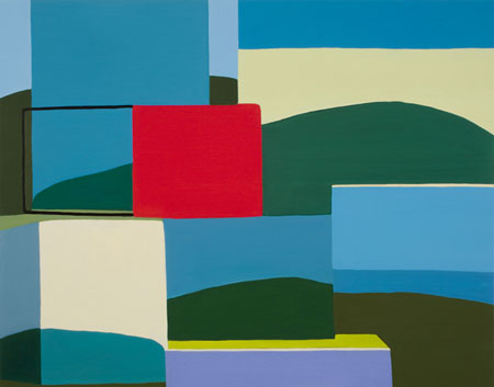 Belcourt�s process is revealed through varying degrees of abstraction. Hedgeland Painting #13 features cube-like forms with simplified landscape views. Mountainous shapes curve and undulate. A red block of color jumps from the picture plane, and the block is mirrored in a silhouette of black line. Perspectives shift, and vistas appear both near and far. Layers of oil paint give a sensual and organic quality to the forms, suggesting a mysterious life source.