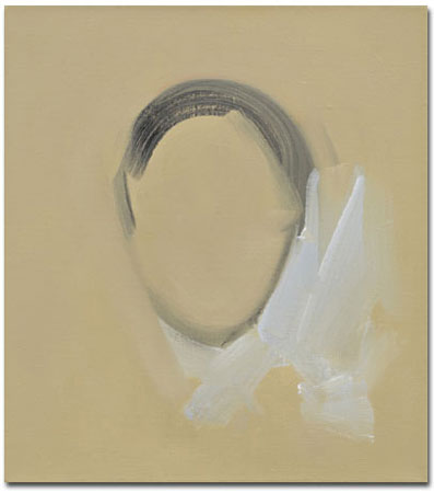 Here, a cool blue colour gradient that brings to mind a horizontal line as a minimum of landscape. There, no more than three spotty blobs on a black background that, readable as a head and hands, let the viewer see a standing figure. Michael van Ofen�s new pictures are even more reduced than what we have come to expect from his former works. They are further tapered to that turning point at which a picture becomes visible and achieves a specific presence between pure painting and imaginative space. Van Ofen has always worked on this fine line between artistic abstraction, collected objectivity and perceptive image. He exploits the area as a region of tension. In this region, it is about convincingly and clearly hitting the artistically important point where these aspects intertwine, almost become crystallised, and where a picture may even open up further into quiet irony and something silently cryptic. Van Ofen unfolds the simple into the complex, and the work is really about reinventing this again and again, staging it as if undecided between the art of painting�s objective reference and self-reference. By now, van Ofen manages to get to this point using the bare minimum.