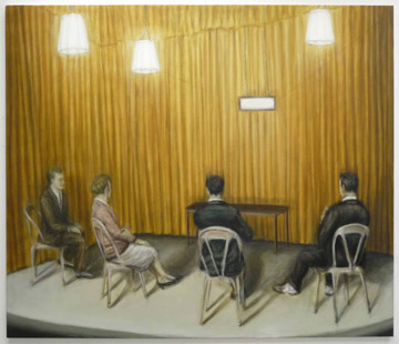One of the central works in the exhibition A Great Void is The Count (2010). Four people sit on a podium and stare at an empty table. The room is closed off by a grand yellowish-golden curtain. Through the curtain, blurred perspective lines forming an empty, seemingly endless corridor are visible. The shadows of the sitting figures slip away, underneath the curtain, in the direction of the empty space. The thin atmosphere in which the events are steeped, feels like an evacuated room where the aspect of �time� is cancelled, as if in this world, the sense of discomfort would last forever.