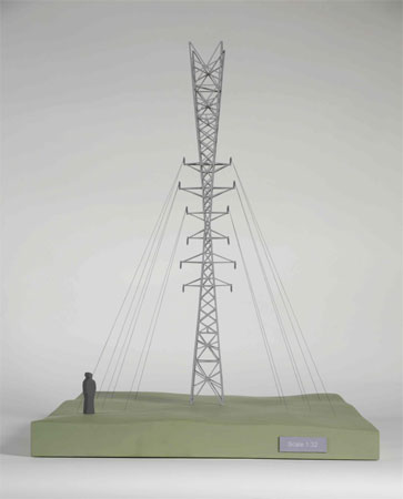 For his proposal, Visocchi has taken scaled down models of electricity pylons found near Ragley and placed one on top of the other. Constructed in galvanized mild steel, the sculpture will stand as a contemporary monument to modern day technology and, at 18m in height, will be an impressive presence in the landscape. In choosing to take the form of the pylon as his Jerwood sculpture, Visocchi makes us think again, not only about the design of these structures, which so often we do not even notice in the landscape, but about the 21stcentury issues of climate change, carbon footprints and renewable energy.