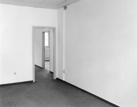 | FLORIAN SLOTAWA NOVEMBER 21, 2009 - JANUARY 30, 2010 Opening, Friday November 20, 2009, 18.00-20.00 Exhibition period: November 21, 2009 � January 30, 2010 Galerie Nordenhake is pleased to present its first solo exhibition with Florian Slotawa. Instead of bringing new objects into the world, the artist recontextualises and rearranges what already exists and frequently develops his works through an intensive dialogue with the places in which they are presented. His fascination for shifts in meaning and the temporary reassignment of function is an important point of departure for this exhibition, which brings together photographs of his studio with a sculptural intervention. The artist is known for his radical process, in which he uses his own possessions-from a car to a pair of skis-as sculptural material. His personal objects can, for a short time, transform into a meaningful work - as is the case with the aptly named "The Last Judgment" - only to land back in his apartment after the end of the exhibition as banal, functional objects. With these so-called "Besitzarbeiten" ("property works"), he has been developing since 1996 an array of temporary sculptural installations with high complexity and an emphasis on formal precision. The newest was generated this year for his recent solo exhibition at P.S.1, New York, and deals with Mondrian's "Pier and Ocean" (a seminal work from Mondrian's development of Geometric Abstraction). The "Besitzarbeiten" initiate both existential and general questions about the role of the possession in our culture, the differentiations between public and private, and the boundaries between the everyday life of the artist and his studio practice. They continually bring up artistic problems, which Slotawa has developed and explored in other bodies of work. In the small-format photographs showing his studio space, the artist brings a heightened focus to the identity and meaning of those things that punctuate our immediate environment, and examines them in this instance with the rooms of his workspace as a location of artistic production. He systematically investigates the five rooms of his Berlin studio. The rooms are simultaneously the object of the images and the place of their formation: for the creation of the baryte prints, Slotawa constructed a darkroom in his studio. The neutral, economically straight-forward black-and-white photographs - often only informative, documentary views - show nearly empty rooms, and draw one's attention to the objecthood of the building's structure, much like the artist's exhibition "One After the Other" in the Arthouse Austin (2007). Details such as the colour of the walls, the door signs, electrical cables or spots on the floor catch the eye - structures and traces of earlier use, which the artist did not erase upon occupying the space. Slotawa uses the medium of photography in the sense of an extended concept of sculpture, to visualize the interim and final results of a comprehensive working process. Often the photographs are, as in the case of his hotel series from 1998-99, the only visual manifestation of the sculptural intervention. Here, in this new series, the studio photographs are juxtaposed with the sculptural intervention in the gallery space. Florian Slotawa has ripped out pieces of his studio's walls and transferred them to the gallery space. During the duration of the exhibition, the physically displaced architectural pieces are layered against the storefront window, through which the gallery space opens onto the street. The installation changes the usual spatial impression of the gallery and conceptually links both the artist's workspace and the exhibition space. Through this unexpected intervention, our everyday perception of these places and their fluctuating relationship to one another becomes destabilized. Florian Slotawa was born in 1972 in Rosenheim, and currently lives and works in Berlin. His solo exhibitions include P.S.1, MoMA, New York (2009); "Solothurn aussen", Kunstverein Solothurn, (2008); "One After the Other", Arthouse, Austin (2007); "Land gewinnen", Haus am Waldsee, Berlin (2005); "Bonn ordnen", Bonner Kunstverein (2004); und "Gesamtbesitz", Kunsthalle Mannheim (2002). He has taken part in numerous group exhibitions, most recently "Photodimensional", Museum of Contemporary Photography, Chicago (2009) and "Interieur/Exterieur. Wohnen in der Kunst", Kunstmuseum Wolfsburg (2008), as well as "Zwischen zwei Toden", ZKM Karlsruhe and "Made in Germany", Sprengel Museum, Hannover (both in 2007). His installation "Ersatzturm" was presented in the 4th Berlin Biennale (2006), "Of Mice and Men". Galerie Nordenhake worked with the artist in 2006 for the group exhibition "Alice Doesn't Live Here Anymore". FLORIAN SLOTAWA NOVEMBER 21, 2009 - JANUARY 30, 2010 Die Galerie Nordenhake freut sich, Ihre erste Einzelausstellung mit Florian Slotawa zu pr�sentieren. Statt neue Objekte in die Welt zu setzen, re-kontextualisiert und re-arrangiert Florian Slotawa in seinen Arbeiten das bereits Vorhandene und entwickelt sie zumeist in einem intensiven Dialog mit dem Ort, an dem sie pr�sentiert werden. Die Faszination f�r vor�bergehende Umwertungen und Bedeutungstransfers war auch ein wichtiger Ausgangspunkte f�r die Ausstellung, in der er einen skulpturalen Eingriff mit Photos seines Ateliers verbindet. Der K�nstler wurde mit dem radikalen Ansatz bekannt, seinen eigenen Besitz, vom Auto bis zu den Skiern, als bildhauerisches Material zu verwenden. Seine pers�nlichen Gegenst�nde konnten kurzfristig zu einem bedeutungsvollen Kunstwerk wie dem �J�ngsten Gericht� werden und landeten nach Ende einer Ausstellung als banale Funktionsgegenst�nde wieder in seiner Wohnung. Mit den so genannten �Besitzarbeiten� schuf er seit 1996 eine Reihe von tempor�ren skulpturalen Installationen von hoher Komplexit�t und gro�er formaler Kraft. Die Neueste entstand in diesem Jahr f�r seine Einzelausstellung im