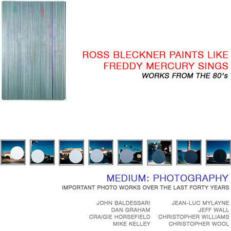 | WEST GALLERY ROSS BLECKNER PAINTS LIKE FREDDY MERCURY SINGS WORKS FROM THE 80's August 14 - October 9, 2010 Opening reception: Saturday, August 14, 5 to 7pm Patrick Painter, Inc., is proud to present an exhibition of paintings by New York artist Ross Bleckner. The show, opening in the West gallery on August 14th, will feature five works that come together to cohesively represent Bleckner's works during the 1980s. Throughout his career, Ross Bleckner's paintings have been largely an investigation of change, loss, and memory, often addressing the idea of mutating of viruses. By this, his art can be read as finding beauty in our inherent vulnerability. Bleckner uses symbolic imagery rather than direct representation, and his work is visually elusive with forms that constantly shift appearance. "So much of my work is about building up and taking apart," stated Bleckner, "about how the shapes form and uniform, how they dissolve and reassemble." Two of the featured paintings, Unknown Quantities of Light (1987) and Stripe Painting with Bird (1989; pictured above) are both prime examples of Bleckner's stripped motifs that were employed frequently during this period of his career. His use of obscure forms, hidden by the monochrome overlay, are employed to signify change and the deterioration of memory. The included work Small Count No Count, (1989) is a display of Bleckner's exploration of mutations at the cellular level in response to his being affected by particular illnesses. This brings into thought the imagery of things in flux that are briefly glimpsed, the act of going from sick to healthy, and back again. By smearing and blurring the painted surfaces, he makes the delicate subjects appear all the more tenuous, which acts as a metaphor for fragile beauty. Bleckner attended New York University before earning his MFA at the California Institute of the Arts in 1973. Works by the Bleckner are held in collections around the world including the Museum of Contemporary Art in Los Angeles, Astrup Fearnley Museet for Moderne Kunst in Oslo, Museo National Centro de Arte Reina Sofia in Madrid, the Whitney Museum of American Art, the Museum of Modern Art, and the Solomon R. Guggenheim Museum in New York. EAST GALLERY MEDIUM: PHOTOGRAPHY IMPORTANT PHOTO WORKS OVER THE LAST FORTY YEARS August 14 - October 9. 2010 Opening reception: Saturday, August 14, 5 to 7pm Patrick Painter Inc. is proud to present a group exhibition of photography in the East gallery at Bergamot Station, featuring important conceptual photo works by artists John Baldessari, Dan Graham, Craigie Horsefield, Mike Kelley, Jean-Luc Mylayne, Jeff Wall, Christopher Williams, and Christopher Wool. A series of eight photographs, titled National City (ed. 1996/2009) will be featured in the exhibition by the widely respected master John Baldessari. These images were taken of his hometown near San Diego, and include a painting of a grey circle in each cityscape that is employed to lure the eye to the visual margins of each photograph. These are prime examples of Baldessari's interest in the banality and truth that is so essential to his work. Baldessari has been exhibited at institutions that include the Tate Modern in London, the Metropolitan Museum of Art and the Museum of Modern Art in New York, the Museu d'Art Contemporani de Barcelona, and a current retrospective at the Los Angeles County Museum of Art. Dan Graham has proved himself to be an all-encompassing artist in his thirty-plus year career. Entirely self-taught, his wide variety of work consists of performance art, installations, video, sculpture, and photography. A fine example of his conceptual photography from the 1960s will be featured in the exhibition, entitled Robert Smithson (ed. 1968/1993). He work has been exhibited in a retrospective at the Museum of Contemporary Art in Los Angeles, Moore College of Art and Design, the Mus�e d'Art Moderne de la Ville in Paris, Kroller-Muller Museum in Holland, and the Kaisma Museum in Helsinki, Finland. Kelley is also the focus of an upcoming retrospective at the Stedelijk Museum in Amsterdam. English artist Craigie Horsfield prints the black and white photographs of his surroundings and the people around him many years after they were initially shot, thus bringing memory and reality into contrast. His photographs are often part of collaborative social projects that are concerned with how individuality is reliant upon the relationship to one's surroundings. Horsfield was a Turner Prize nominee in 2006, and his works have been shown many international venues including Documenta XI in 2002 and in the Whitney Biennial in 2003. Mike Kelley's work grapples with mass culture's representations, undermining sacrosanct subjects (history, art, philosophy, religion, science) and their practitioners through popular culture's leveling and debasing inscriptions.His diverse range of works include textiles, drawings, assemblage, collage, performance, photography and video installation. Kelley earned his BFA in 1976 at the University of Michigan and received his MFA from the California Institute of the Arts in 1978. His work has been exhibited at venues that include the Museum of Contemporary Art in Los Angeles, the New Museum in New York, the Tate Liverpool, and Centre Georges Pompidieu in Paris. For more than thirty years French photographer Jean-Luc Mylayne has explored the intimate bond between subject and photographer through a non-traditional approach that combines precise conception, visionary inventiveness, and infinite patience. Mylayne's photographic subjects, commonplace birds such as sparrows, starlings, and bluebirds, belie the unique experience that Mylayne captures in his photography. His work has been shown at the Cleveland Museum of Contemporary Art, the Henry Art Gallery in Seattle, and the Mus�e d'Art Moderne, Saint-Etienne. Canadian artist Jeff Wall is well known for his large-scale cibachrome photographs that are strategically bac