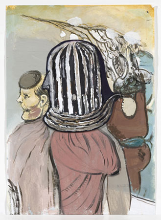 Neal Tait, Untitled (caged head), 2008 acrylic and tempera with collage on paper 25 5/8 x 19 inches (framed) 65.1 x 48.3 cm (framed)