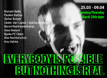 | Time To Meet presents: EVERYBODY IS POSSIBLE BUT NOTHING IS REAL OPENING MARCH 24TH 6PM Exhibition open March 25th � April 9th Romain Bailly Paulien Barbas Stefan Burger C�dric Van Caeter / Jeanne Boukraa Bernd Kleinheisterkamp Alexi Meteni Bjarke PZ Olsen Abe Rechterschot Anu Vahtra The artist's job is to build the world of tomorrow. The strategies are contradictory. Some are suggesting forms, images, ideas, while others are busy deconstructing them, pointing behind the curtain. EN Artists build the world of tomorrow! The Brussels gallery Aeroplastics hosts in its upcoming exhibition 10 international artists presenting contradictory strategies in contemporary photography, video and painting. Some are creating forms, images and ideas, while others are busy deconstructing them, analyzing structures and processes, pointing behind the curtain. Building up and tearing down, construction and deconstruction are the major key-words within the chaotic variety of artistic strategies in the context of EVERYBODY IS POSSIBLE BUT NOTHING IS REAL. No matter if one is looking for meaning or unveiling its falsity, both actions are ro-mantic in the attempt to obtain some kind of reality. The utopian gesture of pointing at brightness and claiming it's the light. According to the title, inconsistency beats exclusivity when it comes to describing the world. Nevertheless, any conclusion is possible, one just needs to decide where to be positioned. FR Les artistes construisent le monde de demain! La galerie bruxelloise Aeroplastics invite pour sa prochaine exposition 10 artistes internationaux qui rassemblent des notions contradictoires en photographie, video et peinture. Certains cr�ent des formes, images et id�-es, d'autres les d�construisent, par l'analyse des structures et des proc�d�s, en d�voilant leur antichambre. Construire et d�faire, constituer comme suspendre sont autant de strat�gies artistiques qui �tayent EVERYBODY IS POSSIBLE BUT NOTHING IS REAL. Qu'il s'agisse de don-ner un sens ou d'en d�masquer sa vanit�, l'acte sous-jacent est romantique dans sa tentative d'obtenir une r�alit�. C'est le geste utopique de pointer une �claircie et de pr�tendre au soleil. Selon le titre, l'incoh�rence s'impose quand on en vient � d�crire le monde. N�anmoins, toute conclusion reste possible, � chacun de prendre la place qui lui convient. NL Kunstenaars bouwen de wereld van morgen! De Brusselse galerie Aeroplastics brengt in haar komende tentoonstelling 10 internationale artiesten samen die tegen-gestelde standpunten in hedendaagse fotografie, video en schilderkunst voor-stellen. De ene kunstenaar cre�ert vormen, beel-den en idee�n, terwijl de ander deconst-rueert door het analyseren van structuren en processen, het onthullen van wat zich achter het gordijn afspeelt. Opbouwen en afbreken, constructie en deconstructie zijn de belangrijke trefwoorden binnen de chaos aan uiteenlopende artistieke stra-tegie�n in de tentoonstelling EVERYBODY IS POSSIBLE BUT NOTHING IS REAL. Het is van weinig belang of men zoekt naar betekenis of dat men zich er juist van wil ontdoen, beide acties zijn romantisch in hun poging een zekere realiteit te vinden. Het utopische gebaar van klaarheid scheppen wanneer men het licht heeft ontdekt. Zoals weerspiegeld in de titel overwint inconsistentie van exclusiviteit wanneer men de wereld wil beschrijven. Desal-niettemin is elke conclusie mogelijk en moet de toeschouwer zelf uitmaken waar hij zich kan positioneren. ROMAIN BAILLY (FR/BE) I would like to be able to build something, but I haven't got enough interest in the finished product, in fact my work is not what it is, but what it tells. It means that the wheels I've made (I, II, III, IV) are not wheels but the circle, the endless beginning; the portrait does not represent people but the gaze, the one of fear, of hope and of sadness; Igreja is not a church but the envy of a church. I think that we can't build anything, but we are searching, and this investigation may only happen through the literary, plastic or philosophical image. PAULIEN BARBAS (NL) What I want to show is the image itself. Not as a transparent medium that shows the world, but as a medium that renders reality in a specific way. The limits of photography are distorting and defamiliarizing my images and make them balance between something familiar and something new. Using existing images and works of art gives me the possibility to apply the medium for what is has been originally invented: the documentation of what�s already there, with all its restrictions and possibilities. STEFAN BURGER (DE/CH) (based in Zurich) explores the medium of photography, creating fragile installations that extend into theatre-like mis-en-sc�ne. In recent years Stefan Burger has expanded his use of photography into wallpapers and installations, and he has taken on new media such as 16mm film and even performance-based work. Photography is often no longer recognizable as the initial point of departure. Burger�s work is a wistful investigation of production and consumption in the system of art. At the core of the artist�s work is a preoccupation with art history and theories from the academic canon, which he references and negotiates with sharp, profound, and humorous gestures that frequently shed light on the systemic principles underlying production and consumption. Stefan Burger�s gaze often also turns from these art historical and theoretical manifestations to his own role as an artist and examines the expectations of and pressures on the protagonists operating in this field. Toying with a kind of detachment or ambivalence in the artists� role as producer, and touching on existential themes such as the fear of collapse or definitions of value and validity, the artist gene-rates pointed remarks with wit and incisiveness. (Freymond-Guth Fine Arts, Zurich) C�DRIC VAN CAETER (BE) For the last couple of years I have travelled in Euro