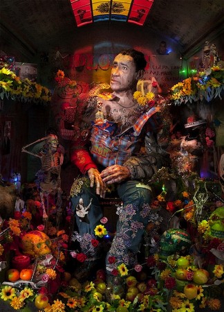 | Jasper de Beijer MARABUNTA May 31 - July 7, 2012 Opening Reception: Thursday May 31, 6 - 8 pm Artist Talk & Book Reception: Saturday June 9, 4 pm Asya Geisberg Gallery is pleased to present Marabunta, an exhibition of photographs by Dutch artist Jasper de Beijer. In each of his prior series, De Beijer has created elaborate models in his studio out of paper and other sculpture materials, based on images from media and historical sources, and often concerning colonialism and its representation. In each series, he approaches the very nature of historical depiction, using varying modes of photography and questioning culturally embedded images. With Marabunta, De Beijer takes the paraphernalia of the Mexican drug war as his inspiration, particularly the mystical and visually obsessive interest in celebrating the flamboyant lives of its leaders and colorful deaths of its victims. De Beijer carves a world in Marabunta that is alarming, chaotic, and reverential - an unnerving amalgam of the omnipresent iconographies of death. Dominating our news, the cartel wars in Mexico have resulted in increasingly more outrageous acts of murder and mayhem. Bodies are beheaded, covered in warnings and signs, left in broad daylight and in city centers. A pre-existing culture of skeletons and ghosts, festive and even fanciful, coincides with the idolization of these killers and criminals, resulting in gigantic extravagant mausoleums resembling churches, and a general conflation of the gaudy shrines with those of beatific martyrs and saints. De Beijer exploits these glorified graveyards and bloody scenes of murder in his hyper-detailed, entirely fantastical staged scenes. With frenetic color and texture, a frisson of the real and media-influenced, and constant hints at the fabricated nature of De Beijer’s images, the photographer never quite allows a specific point in the continuum between the real and the imagined for the viewer to land. In De Beijer’s afterworld, the characters are eerie facsimiles of living ghosts, one foot made of plastic, and a face of duct-taped tattooed texts. The resulting strange purgatory is then multiplied: as the outsider, De Beijer forms his own mythology, interweaving distorted and refracted visions gleaned from reality. In his version of the afterlife, the dead refuse to die, and the horror of their living days shines brightly and yet ominously, refusing to be put out. The second part of the gallery is devoted to a brief overview of De Beijer’s previous bodies of work, including examples from the Riveted Kingdom (2008) and Udongo (2009) series. Please contact the gallery for further images or information. Jasper de Beijer attended the Amsterdam Hogeschool voor de Kunsten, and the Hogeschool voor de Kunsten Utrecht. His solo exhibitions include The Hague Museum of Photography, the Museum of Contemporary Art, Denver, Museum Het Domein in Sittard (The Netherlands), Gallery Nouvelles Images – (The Hague), Gallery TZR-Kai Bruckner (Dusseldorf), Hamish Morisson Gallery (Berlin), the Empire Project (Istanbul) and Studio d’Arte Cannaviello (Milano). He is part of a large number of collections, including the Bank of America, the Gemeentemuseum (The Hague), and the Rabobank collection. | ||||