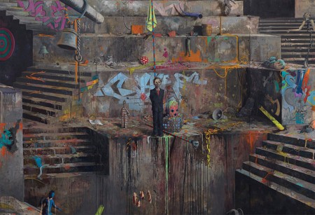 | Jonas Burgert | Gift gegen Zeit 28 April 2012 – 7 July 2012 Berlin For his debut exhibition at Blain|Southern Berlin, Gift gegen Zeit (Poison Against Time), German artist Jonas Burgert will unveil a series of new paintings, some monumental in scale, alongside sculptural works. Burgert’s paintings suggest a space in which time is suspended, once removed from our perception of the everyday. It is within this paradigm that the struggle for self-knowledge occurs; human beings are depicted as unique, contorted creatures in the midst of an inquiry into their own existence. They are both familiar and fantastical, creating an environment which is in flux, shifting and changeable. The exhibition’s two largest canvases exist in dialogue. Suchtpuls (Addicted to Pulse), 2011, envelops the viewer in an unrelenting whirlwind of activity, as characters of all shapes and sizes seem to jostle in a collision of religious rituals. Sacred cows are adorned with colourful patterns, and the yellow blossom scattered upon the ground brings to mind the steps at Varanasi, India. Within this dynamic composition, a sea of white-robed figures contrasts with the hubbub of colour; this complex place appears as one of pilgrimage, where people seek cures, enlightenment and solace, but also one that is potentially altogether more testing and unforgiving, as birds of prey swoop, and figures become submerged within a pool of poisonous water. Its companion work, Luft nach Schlag, 2012, depicts the next chapter in this process; the calm after the storm, with a rich silence in which the beautiful mess of the past remains. This concrete, architectural form is a palimpsest, as the stains of yesterday colour the grey steps – a memory from the dynamism of the previous scene. Only one solitary figure remains, alone, centre stage. The last man standing, the authentic self that emerges after the deluge. One can clearly see the influence of Burgert’s home city in this work, and indeed, Berlin, with its ever-changing urban spaces and graffitied walls, is intrinsic to the artist’s oeuvre. For Gift gegen Zeit, Burgert utilises Blain|Southern’s newly refurbished, post-industrial gallery, which formerly housed the printing presses of Der Tagesspiegel. The scale of the paintings plays with that of the space itself, while the sculptures appear to emerge directly from the canvases, as if crawling into their three-dimensional form. Modelled in clay and cast in bronze, each is finished with Burgert’s extraordinarily vibrant palette to form cohesiveness between the wall and floor-based works, which are experienced by the viewer as one and the same. Blain|Southern Potsdamer Straße 77–87 10785, Berlin 30 April–16 July 2011 Private View: Friday 29 April, 6-8pm | ||||