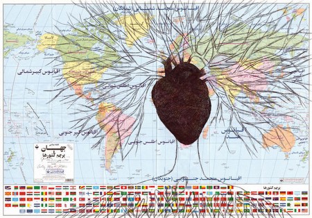 | Geopolitics of Roots — No Man's Land Solo Exhibition by Ghazel CARBON 12 Gallery, Dubai 13th of November 2011 — 08th of January 2012 Opening Event: Sunday, November 13th, from 20:00 — 23:00 Carbon 12 is proud to bring to the UAE a pioneer of Iranian video and performance art. While Ghazel’s work has been exhibited in many prestigious museums and international biennales, “Geopolitics of Roots — No Man’s Land” provides the unique opportunity to witness the evolution of this amazing artist. The new series is a significant departure from Ghazel’s existing body of work. The interest taken by modern and contemporary artists in corrections and transformations of, as well as creative interventions into, existing physical cartography is another insufficiently explored area of the 20th century art. (Surrealist Map of The World/ 1929/ J. Johns, G. Kuitca, J. Durham, A. Boetti, M. Druks, Land art and Fluxus artists, etc.). They are joined by a number of contributions of imaginary worlds, “outsiders” (Adolf Wölfli); cartographic items of a narrative, fairytale like structure (J.R.R. Tolkien); and finally, the peculiar cartographic solutions of Eskimos and the inhabitants of Polynesian Islands, discovered by cultural anthropology. All that indicates that geographic maps do not function solely to provide easier orientation in space, but have all the elements of a social, economic, political and also – but not less important – aesthetic discourse. This particularly applies to artists who have been displaced, for one reason or another, from their native countries. The picturesque-ness of global cartography, together with the cartographic division of political or economic power enables artists to integrate an ethical message, very often a strong one, into their aesthetic dialogue with geography. It is precisely due to this and such positions, that artists are entitled to move freely within given cartographic determinants, and to find in global transit, where and how to build their own, even if temporary nest. When J.L. Borges imagined and suggested a life-size territorial map, entire cartography was elevated to a mental level by his proposition. Namely, it has been shown that analogue and digital map of the globe is a fictitious product of the Western Cartesian rationality and that at the opposite, or rather higher level, exist worlds that are not subject to the known laws of geometry and physics. Still, the visual and semantic potential of geographic maps and atlases are multilayered and significant, and it is upon this potential that artists-cartographers formulate and build their creative dialogue with the world that surrounds them. Uprooted from her homeland, relocated a long time ago to a new one, Ghazel (1966), in search of an identity, has placed herself into the wide field of creative ‘interstice’. She may belong to the huge community of ‘others’, but she has saved for herself the freedom of a nomad, a wanderer through space and time, finding strong holds equally in tradition, as in her contemporariness. The map of the world occasionally serves her as a fan, to cool down the intensity of her artistic ‘in-between’ position, but also as a background for her personal confession. When she returned to drawing, at the beginning of 2009, rather than allowing the drawing its authentic autonomy, Ghazel integrated it in the global poetics of metaphorical space. Into that space, by a very accurate choice of the domineering symbol in her cartography, she brought the memory of a nomad with roots somewhere on the South Pole and a ramified crown on the Northern hemisphere. Everywhere and also nowhere, Ghazel – a ‘hybrid Iranian nomad’- as she is carefully reconsidering her position from Paris. Wrapped in a black chador in her performances, Ghazel persistently paints her own destiny, searching for a solution on how to find the place of her own tranquility, while always being on the move. She is fully aware that this destiny is not only hers, but she shares it with a huge population of contemporary nomads who wander in the world so as to at least on a cartographic projection, take root and ramify the crown of their own identity. While her early work “Me” (1997- now) often contained certain irony, and the silent film “humor”, her most recent cycle “Geopolitics of Roots ¬— No Man’s Land” is a specific artistic discourse, which looks into, from a position of individual experience, a serious global problem which is often ignored. In case of trouble, the luggage is always ready. As a socially involved artist, Ghazel has taken cartography as an attractive medium through which she transmits her poetic messages. They focus less on the world that had initially, ideally, been analogously drawn, and later digitally projected by technocrats and experts, and more on the reality that, of course, does not correspond to the perfectionist high-tech geographic informational system. Text by: Zelemir Koscevic Text translated from Croatian by: Karla Vlahovic Text edited by: Houmaan Assari | ||||