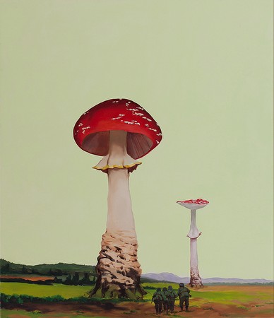 | GAMA: Idylls of the Kings March 7 – May 3, 2015 Chambers Fine Art is pleased to announce the opening on March 7, 2015 of Gama: Idylls of the Kings. GAMA was born in Mongolia in 1977 and currently lives and works in Berlin. GAMA was born into a nomadic family and would move every four months as the seasons changed. His great aunt was an important shaman whose ability to connect with the supernatural world had a profound impact on the young boy. He eventually enrolled at the Central Academy of Fine Arts (CAFA) in Beijing where he studied oil painting. Finding that the prevailing academic approach did not satisfy him, he started looking at the works of European Old Masters in art books and pondering the works of contemporary German painters such as Georg Baselitz, Sigmar Polke and Gerhard Richter. Thus Beijing was a brief hiatus between the country of his birth and Germany, the European country which seems to have the greatest affinity with the mysterious and uncanny, the birthplace of countless myths and legends not to mention the Brothers Grimm whose fairy-tales still enchant. In 2002 he gained entry to the Karlsruhe Academy and in 2007 became a master student under Gustav Kluge. During this period he was exposed to the figurative painting of the New Leipzig School and soon found that the painterly skills and techniques he had mastered in Beijing could be used for entirely different ends than the more prosaic task of recording appearances. When we look at GAMA’s paintings we are never allowed to forget that an oil painting is just that – oil paint squeezed from a tube and applied thickly or thinly on a primed canvas. Very often the main image which does not quite reach the edge of the canvas is surrounded by a thick layer of paint, leaving the impression that it could be peeled off to reveal a blank canvas. Elsewhere, dripping accumulations of paint question the illusion of three dimensional spaces. Scale is constantly called into question and inside becomes outside. Mushrooms the size of trees dominate Manoeuver, while in others furniture towers over human figures or vice-versa. Figuration disrupts abstraction as we see so often in the Riding Alone for Thousands of Miles series of paintings in which there is always a contrast between the sky and the land, one of which is conveyed as a passage of abstract painting that echoes Gerhard Richter while the other is represented naturalistically. A dramatic example of this device can be found in Armored Car which is divided into four zones – a lonely traveler in the lowest zone, a band of clouds in the next followed by a range of mountains and a cheerful checkered sky into which a tiny lamp hangs from the top edge of the canvas. Mushrooms, manikins and other low-life characters also meet high culture as GAMA has a strong attachment to a broad cross-section of Western Old Master and Nineteenth century painting. The attentive viewer has no trouble in identifying references to Vermeer, Rembrandt, and Courbet among many others in these quirky interiors. Not surprisingly, German Romanticism is very much in evidence. Caspar David Friedrich’s great masterpiece The Sea of Ice (1823-24) is revived in Sacred Flame, the frozen wastes of the original parting to reveal a colorful shipwreck in the bottom right-hand corner of the painting. All of this might be too much to take were it not for the fact that GAMA’s erudition is only one component of his thoroughly enchanting update of the world of the imagination that used to prevail before the universal acceptance of computerized fantasy. He is no longer a nomad but he offers insights into the world of the imagination that his previously unfettered way of life offered in abundance. For more information, please contact the gallery at +86 (0)10 5127 3298 or [email protected] | ||||