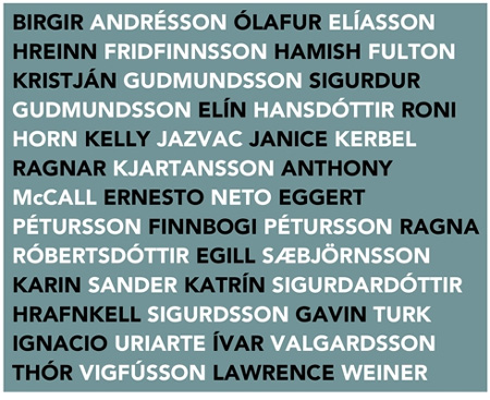 | | | | | | Artists in this exhibition: | BIRGIR ANDR�SSON, �LAFUR EL�ASSON, HREINN FRIDFINNSSON, HAMISH FULTON, KRISTJ�N GUDMUNDSSON, SIGURDUR GUDMUNDSSON, EL�N HANSD�TTIR, RONI HORN, KELLY JAZVAC, JANICE KERBEL, RAGNAR KJARTANSSON, ANTHONY MCCALL, ERNESTO NETO, EGGERT P�TURSSON, FINNBOGI P�TURSSON, RAGNA R�BERTSD�TTIR, EGILL SAEBJ�RNSSON, KARIN SANDER, KATR�N SIGURDARD�TTIR, HRAFNKELL SIGURDSSON, GAVIN TURK, IGNACIO URIARTE, �VAR VALGARDSSON, TH�R VIGF�SSON, LAWRENCE WEINER | | THE WINTER SHOW 2010