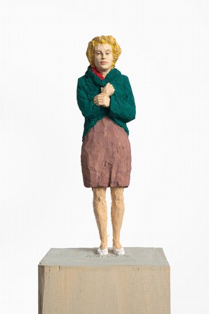 Stephan Balkenhol’s rough-hewn polychromatic wood sculptures and reliefs show people and animals as well as hy brid figures and architecture. He began making his trademark figurative sculptures in the mid-1980s. In response to the abstract, minimalist and conceptual strategies of the Hamburg Academy of the Fine Arts, where he studied with Ulrich Rückriem from 1976 to 1982, Balkenhol focused on the craft of sculpting, drawing on a heritage that ranges from early Christian sculpture to Modernism. He uses chisel and hammer to carve his figures straight out of tree trunks (usually poplar) that have been halved or quartered. From larger-than-life to dwarf-like, his men, women, animals, heads and hybrids of human and animal are carved with inseparable pedestals. Marks made by the tools, grooves, fissures and cracks remain visible, testifying to the working process. This does not preclude a strong sense of realism, reinforced by the treatment of contours, the pose of the figures and the way they are painted. Balkenhol creates basic types in countless variations, displaying them alone or in groups. Not only the men and the women but also the animals reveal nothing about themselves; they tell no stories and represent nothing. They are inconspicuous, ageless and difficult to pin down; they show no emotions and appear curiously detached. They are simply there, serenely self-contained, as if gazing into the void; they are always the same and always new. Enigmatic, nameless and timeless, they are both distinctively personal and blandly anonymous. By eschewing psychological implications, the artist brings to the fore archetypical patterns of existence and emotions, so that his figures – especially those in public spaces – also function as mirrors that reflect viewers’ feelings, desires and hopes. The enthronement of nameless people subverts the nature of the monument, for Balkenhol does not honour rulers, heroes and thinkers; instead he celebrates all that is average, ordinary and anonymous. And, in so doing, he has superbly mastered the grand gesture.