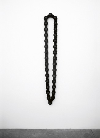 Many of Unzueta's recent sculptures fixate on two basic mechanical parts: the chain and the gear. Unzueta reproduces these components in felt and wood. The shift in material softens the cold replaceability of the metal originals, yet the mechanics still function properly. These sculptures are thus surrogates of the objects they represent. Through the laborious use of craft materials, Unzueta produces frozen shapes that are imbued with the stored time of production.