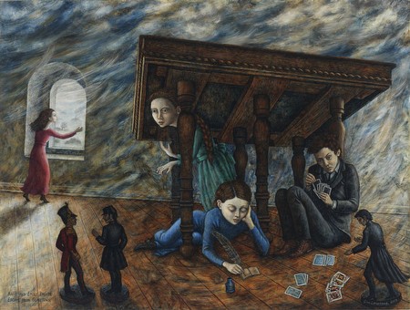 Born in Germany, Kati Heck is based in Antwerp, Belgium. With an intense and provocative sensibility that draws on historical precedents from Surrealism to Social Realism, Heck is a painter of astonishing facility, with an alchemical sensitivity to the human form and a devilish ironic streak. Her paintings incorporate strange scenarios, often sustained for a body of work, involving particular characters based on folks she invites into her studio. The resulting images constitute their own, highly unusual and particular world, a fantasy state, some of which is crafted in dreams. Arms are transparent, strange beasts enter the scene including an ostrich serving coffee to a couple on a futon; a young man’s pronounced varicose veins are matched by the other leg, which seems to be frozen; an animated man in a rocking chair holds a ball of light in one hand, the other submerged in a jar of pickles. This new group of works, which includes a mural-sized painting with a full range of haunting and haunted characters, conjures the supernatural in various ways, invoking a spiritual and material ecosystem as singular and peculiar as it is wondrous and open.