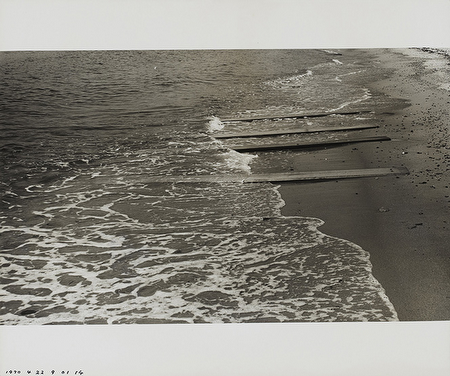 | Tatsuo Kawaguchi "Land and Sea 1970" Sep 4 - Oct 31, 2015 Taka Ishii Gallery New York Opening reception: Friday, September 11 18:00 - 20:00 Taka Ishii Gallery New York is pleased to present “Land and Sea 1970”, the first solo exhibition of Tatsuo Kawaguchi to be held in the United States. On view are twenty-four vintage photographs of “Land and Sea” (1970), printed by the artist in 1970. A variant of this series will be concurrently on view in October as part of the traveling museum exhibition, “For a New World to Come: Experiments in Japanese Art and Photography, 1968-1979” at Japan Society Gallery, New York. A larger version of these images, printed on twenty-six panels for the seminal 10th Tokyo Biennale, subtitled Between Man and Matter, was exhibited at the Tokyo Metropolitan Art Museum, and then traveled to three other venues (Kyoto Municipal Art Museum, Aichi Prefectural Art Gallery, Nagoya and Fukuoka Prefectural Culture House) in 1970. “Land and Sea” is a photographic record of the site specific installation Kawaguchi made using four wooden planks, cut from a single log, and floated along the shore over three days at Suma Beach, Kobe, in April 1970, a locale close to his home. The artist methodically charted the interaction of the wood and the sea with particular attention to the effects of the low and high tide. Each photograph has exact notations of the date and time (hour, minutes and seconds) when it was taken. These essential elements are key to his working process whereby the artwork takes on an action, performance and collaboration with nature. Photography provided the artist with a means to objectively express his vision – a form of depiction exquisitely tied to reality. Kawaguchi is considered one of the pioneers in the field of photographic expression in postwar Japan. “Land and Sea” is representative of the artist’s initial interest in relationship, the theme of great prominence in his oeuvre. The 10th Tokyo Biennale, with its renowned commissioner Yusuke Nakahara, an influential art critic of the time, became a beacon moment when forty international artists including Carl Andre, Sol LeWitt, Richard Serra were exhibited alongside their Japanese contemporaries including Kawaguchi, On Kawara and Jiro Takamatsu. Of great historical impact, the Tokyo Biennale introduced then under recognized new movements such as Arte Povera, Conceptual art and Mono-ha (School of Things) and became a bridge highlighting common international interests. The subtitle, “Between Man and Matter, as the Biennale’s theme particularly resonates with the works Kawaguchi showed. “Land and Sea” visualizes a world between “what can be seen” and “what cannot be seen”. “To reveal the distance between ‘existence’ and ‘the cognition of existence’ by bringing ‘existence’ into our cognition, or to annihilate ‘the cognition of existence’ so that this distance is filled and to make ‘an existence’ out of ‘existence itself’” Tatsuo Kawaguchi, Dai-10-kai Nihon Kokusai Bijutsuten: Ningen To Busshitsu/Tokyo Biennale 1970: Between Man and Matter, exhibition catalogue (Tokyo: The Mainichi Newspapers, 1970) Also on view are two sculptures, “Iron of Iron and/or Tools: File” (1975) and “Iron of Iron and/or Tools: Graver” (1975), which represent the artist’s interests in blur and vagueness which language includes. Kawaguchi placed his iron tools into smelted iron from a blast furnace, thus combining them into a single form. In “Iron of Iron and/or Tools: File” the artist’s file is buried in the bulk and loses its function, becoming barely seen, yet still recognizable. Kawaguchi is distinguished from other artists for this sort of investigation, exploring the themes of relationship between language and recognition through his artwork in various mediums. Additionally presented is the color photograph, “Sea” (1973, printed in 2008). Evoking the same query on significance and signifier, the image captures a moment when water is poured from a bucket into the sea. The water, originating from the sea, is recognized as “water”, rather than the “sea”. The photograph visualizes the ambiguity of language, image and meaning; a critical concept that consistently runs throughout his artistic career. Tatsuo Kawaguchi was born in 1940 in Kobe, and currently lives and works in a remote local in Chiba City. He has remained at the forefront of contemporary art since the 1960s in Japan and is one of the core members of Group “I”, an avant-garde artist collective group founded by nine artists in Kobe City in 1965. His work is notable for its continued investigation of language, object and material and its use of diverse mediums; iron, metal, paper, fabric and wood. Kawaguchi’s solo exhibitions include, “Let There Be Light! Tatsuo Kawaguchi: World after 3/11”, Iwaki City Art Museum, Fukushima (2012); “The Spiral Time”, KAKE Museum of Art, Okayama (2010); “Language, Time, Life”, The National Museum of Modern Art, Tokyo (2009); “DARK BOX 2008”, Nagoya City Art Museum (2008); “The Invisible and The Visible”, Hyogo Prefectural Museum of Art and Nagoya City Art Museum (2007) and “Japan Contemporary Art – Kawaguchi Tatsuo,” Busan Museum of Art, Korea (2003). His artworks have been showed in numerous exhibitions in Japan and abroad, including the Setouchi Triennale 2010 “100-Day Art and Sea Adventure” (2010); The Echigo-Tsumari Art Triennial (2009); “Magiciens de la terre” exhibition at Centre Georges Pompidou, Paris (1989); the Paris Youth Biennale (1973) and the 10th Tokyo Biennale (1970). After the 1990s, his work has been included in institutional collections, such as the National Museum of Modern Art, Tokyo; Museum of Modern Art, Kamakura; National Museum of Modern Art, Kyoto; National Museum of Modern Art, Osaka; Iwaki City Art Museum; Chiba City Museum of Art; Nagoya City Art Museum; Hokkaido Museum of Mod